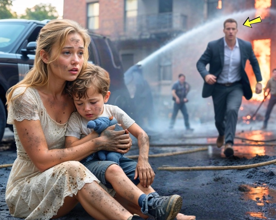 She stumbled out the door just as the first firetruck roared into the drive. Gasps rose from the crowd as she emerged, covered in ash, hair wild, eyes watering. Paramedics rushed forward. She handed the boy to a firefighter, her arms trembling. “He’s okay,” she rasped. “He was alone.” The boy cried out once as she released him, but she was already backing away.
