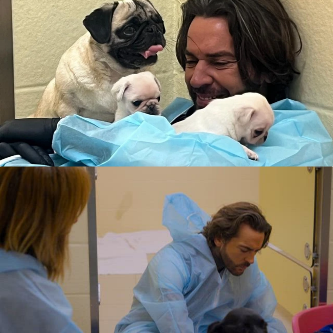 Pete Wicks playing with pug puppies in Pete Wicks: For Dogs’ Sake. UKTV