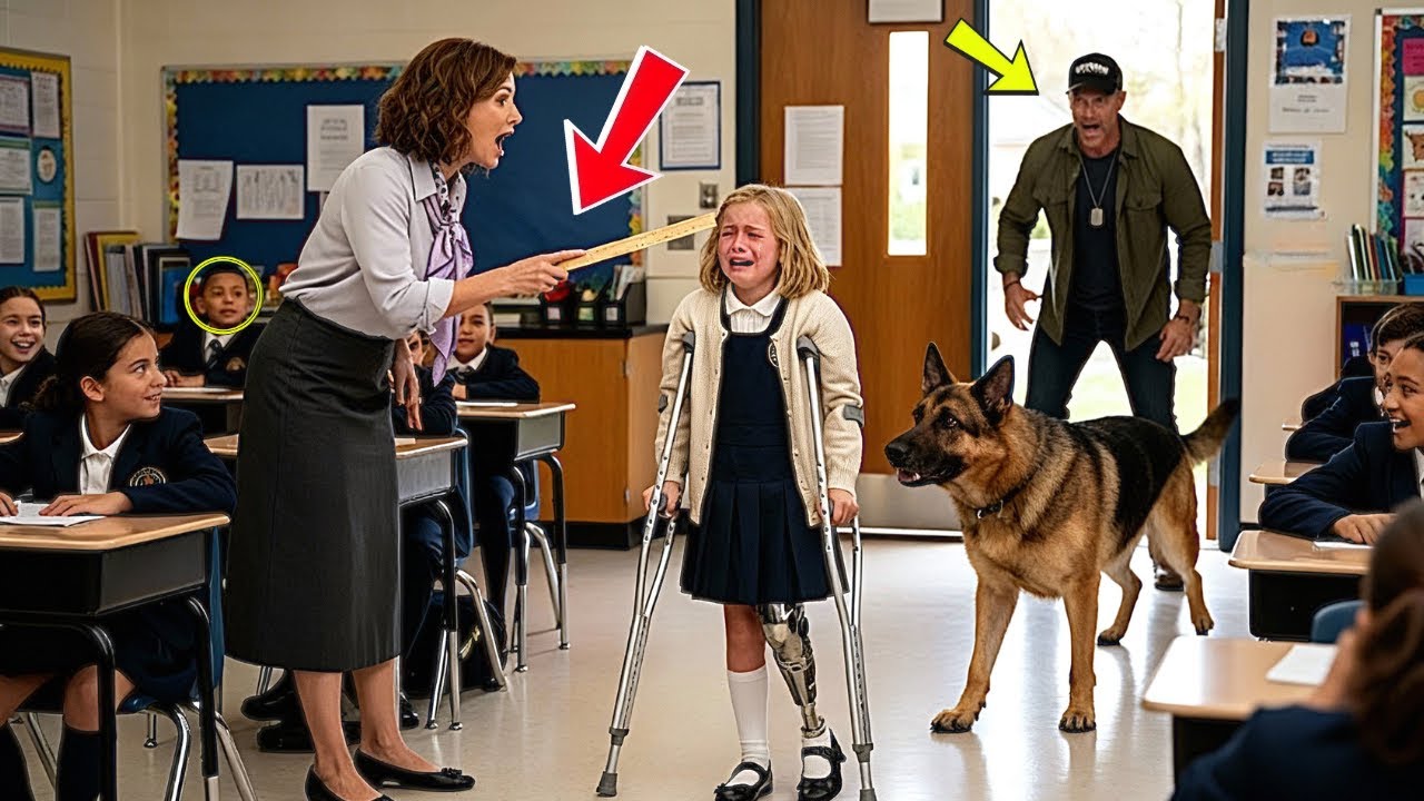 When Mark Jensen, a decorated war veteran, pulled up to his daughter’s elementary school with his loyal K9, Rex, he expected to see her smiling, waiting by the door like always. Instead, the hallway echoed with shouting. Inside her classroom, 8-year-old Emily, who walked with crutches after losing her leg in an accident, stood trembling as her teacher screamed at her for being too slow.