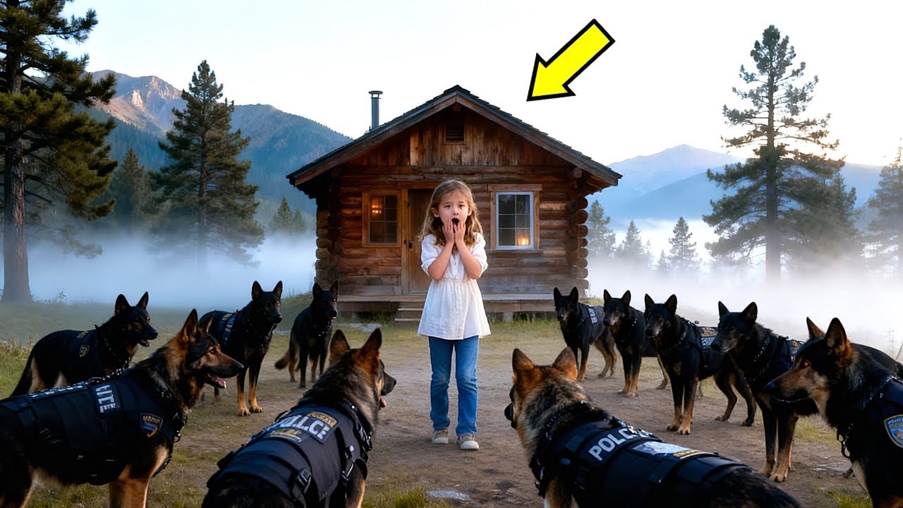 And in the center of that lonely mountain clearing, stood a little girl barefoot, trembling, her hands pressed to her mouth in silent fear. But what froze the world that day wasn’t the girl, it was what surrounded her. 14 police dogs, fully trained kines, formed a perfect circle around the child, their bodies rigid, their eyes locked onto the house behind her.