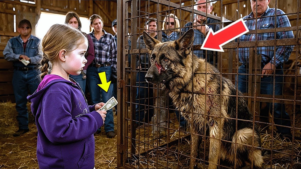 When she stepped forward, her mother tried to pull her back, whispering, “Sweetheart, that dog’s dangerous.” The child only whispered, “No,” he said, she staring into his wounded eyes. “I want to buy him,” she whispered. The crowd gasped. Laughter rippled through the room and then the entire barn fell silent. No one knew what was about to happen next. That this little girl was about to uncover a truth that would shake the entire town.