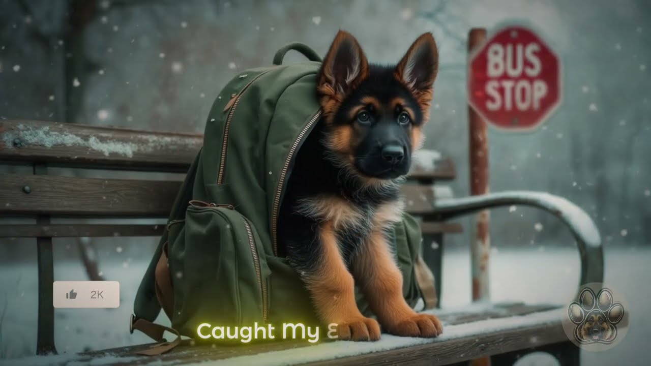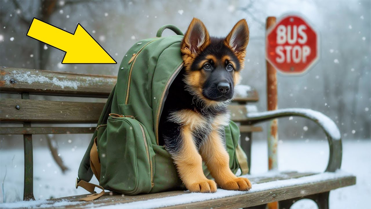 That’s when I saw it. A German Shepherd puppy, five, maybe six months old, curled up tight on the bench of the bus stop, her body tucked inside a school backpack, unzipped, opened just enough to fit her in like someone had packed her away, left her there. The straps dangled to the frozen concrete. Her nose barely poked out.