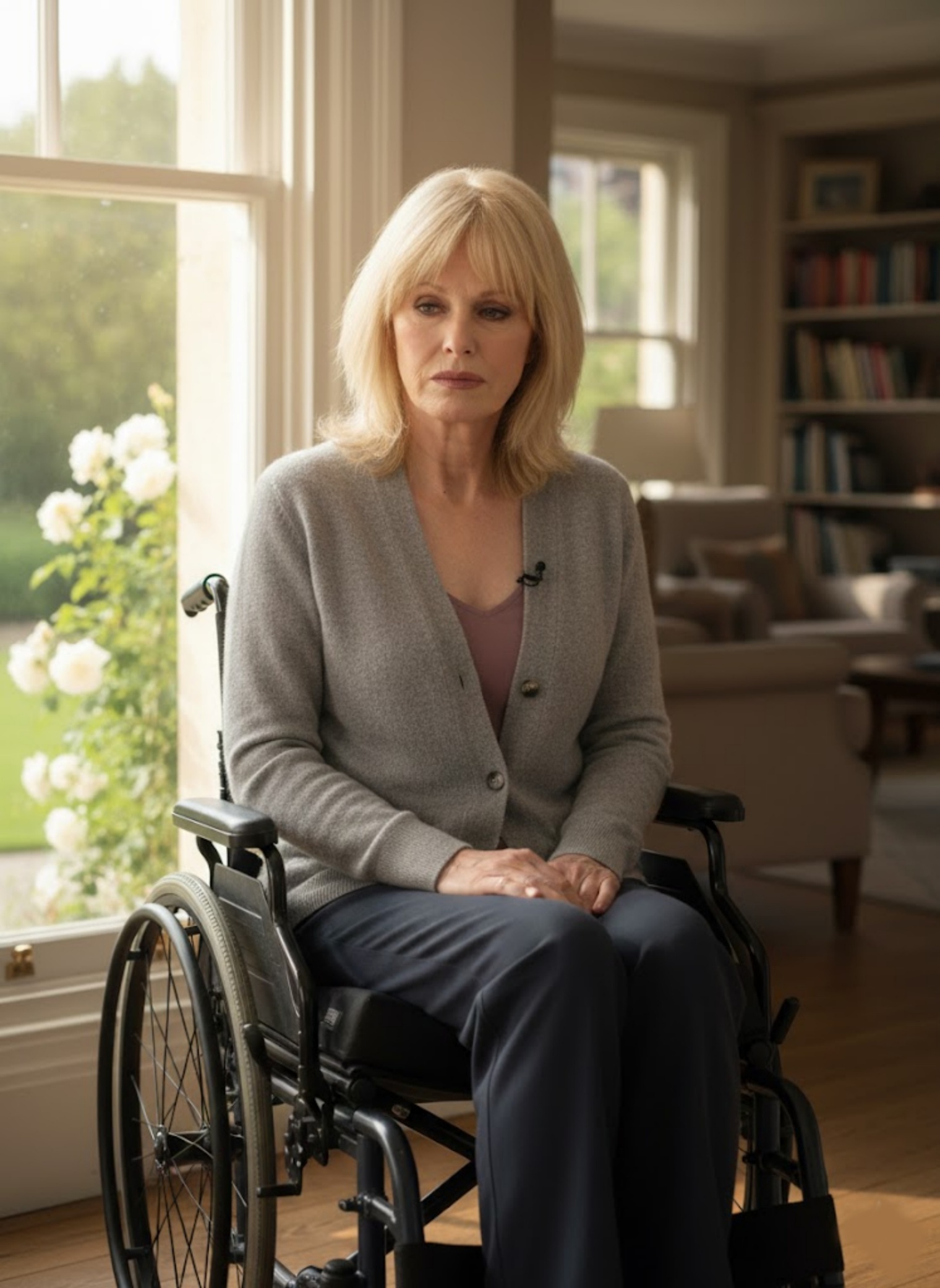 Joanne Lumley appears seated in a wheelchair inside her home, wearing a soft grey cardigan, looking directly at the camera.