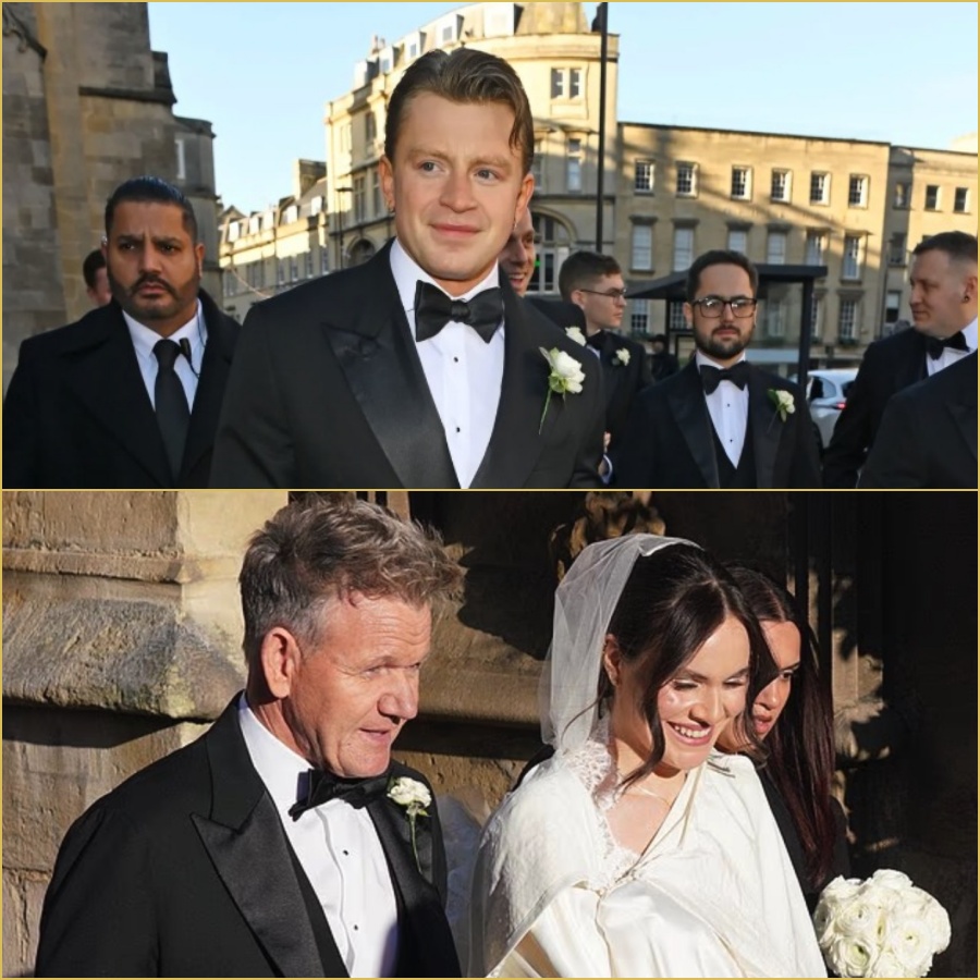 The 25-year-old bride beamed as she stepped out of her car at Bath Abbey, guided lovingly by her father, celebrity chef Gordon Ramsay, 59. Holly kept her wedding dress a closely guarded secret, concealing it beneath an elegant embroidered lace cloak as crowds gathered, desperate for a glimpse of the moment.