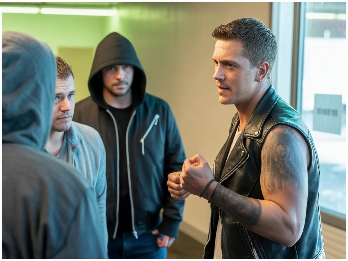It was during his nightly ritual of searching for scraps in a dim alley that his path collided violently with destiny. The sound of angry shouts, sharp and vulgar, sliced through the drumming rain outside a nearby bar. Eli froze, accustomed to avoiding trouble, but drawn by the escalating tension. A large, formidable man, instantly recognizable by his massive frame, heavily tattooed arms, and the distinctive “Hell’s Angels” patch stitched onto his leather vest, was surrounded. The older man, later identified as Ray, looked weary, cornered, and overwhelmingly outnumbered by three younger assailants—mean-looking, drunk, and clearly spoiling for a brutal fight. Ray attempted to disengage, to walk away from the inevitable violence, but his tormentors, energized by their cruelty, only pressed closer, mocking him and escalating the provocation.