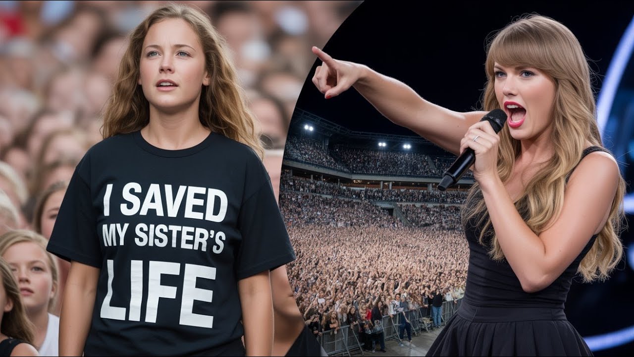 Emma Martinez, surprised and trembling, could barely believe Taylor Swift was calling out to her. “You, the girl in the black t-shirt. Can you stand up?” Shaking, Emma shily rose to her feet, her hands trembling. Taylor pointed directly at the inscription. “Is this t-shirt real? Did you really save your sister’s life?” Emma nodded, her voice barely a whisper into the deafening quiet: “Yes.” The answer, though faint, resonated like a thunderclap across the stadium.